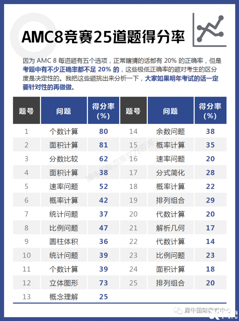 因为 AMC 8 每道题有五个选项,正常瞎猜的话都有 20% 的正确率,但是考题中有不少正确率都不足 20% 的,这些极低正确率的题对考生的区分度是决定性的。我把这些题挑出来分析一下,大家如果明年考试的话一定要针对性的再做做。