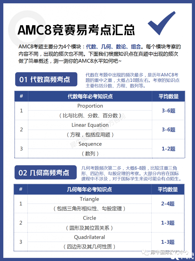 AMC8考题主要分为4个模块:代数、几何、数论、组合。每个模块考察的内容不同,出现的频次也不同。下面我们根据知识点在真题中出现的频次做了简单概述,测一测你的AMC8水平如何吧~