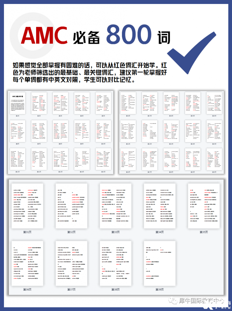 其中包含 AMC8/10/12 所有必备词汇,是你在 AMC 考试中获取高分的保证,是你成功迈向大学的关键一步。800多个词,对于任何人来说都不容易一遍掌握,所以,如果感觉全部掌握有困难的话,可以从红色词汇开始学。
