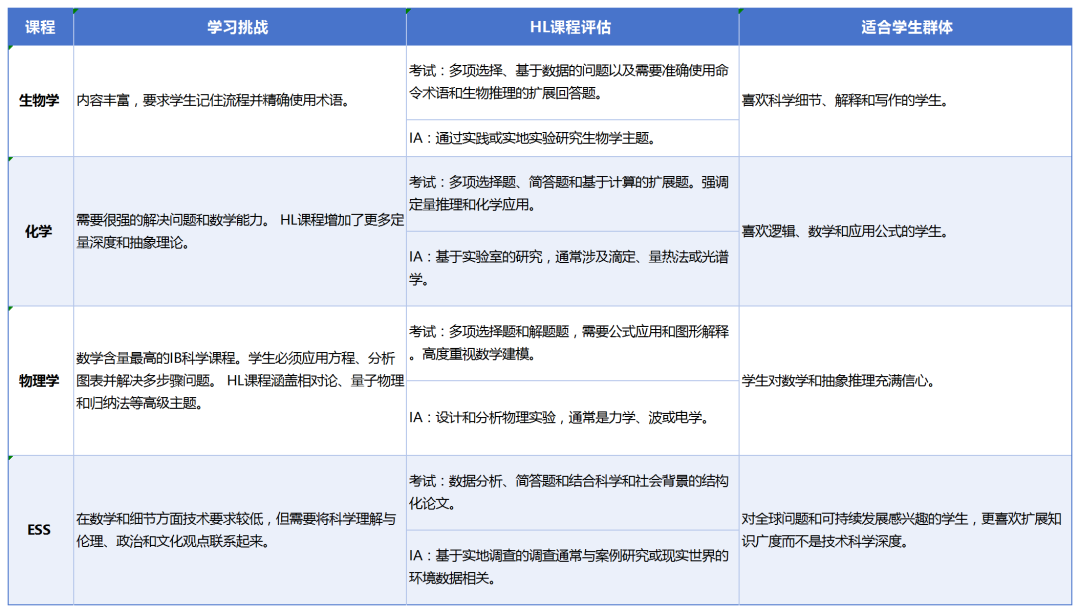 IB科学课程培养的技能,如实验设计、数据分析和科学交流等,但是学习不同的IB科学课程,学生需应对的挑战也有所不同。课程适宜的学生群体也不一样。